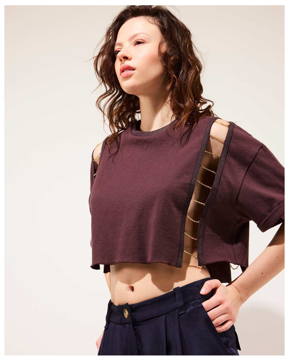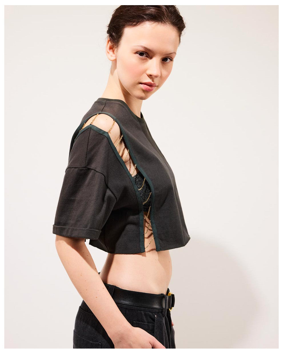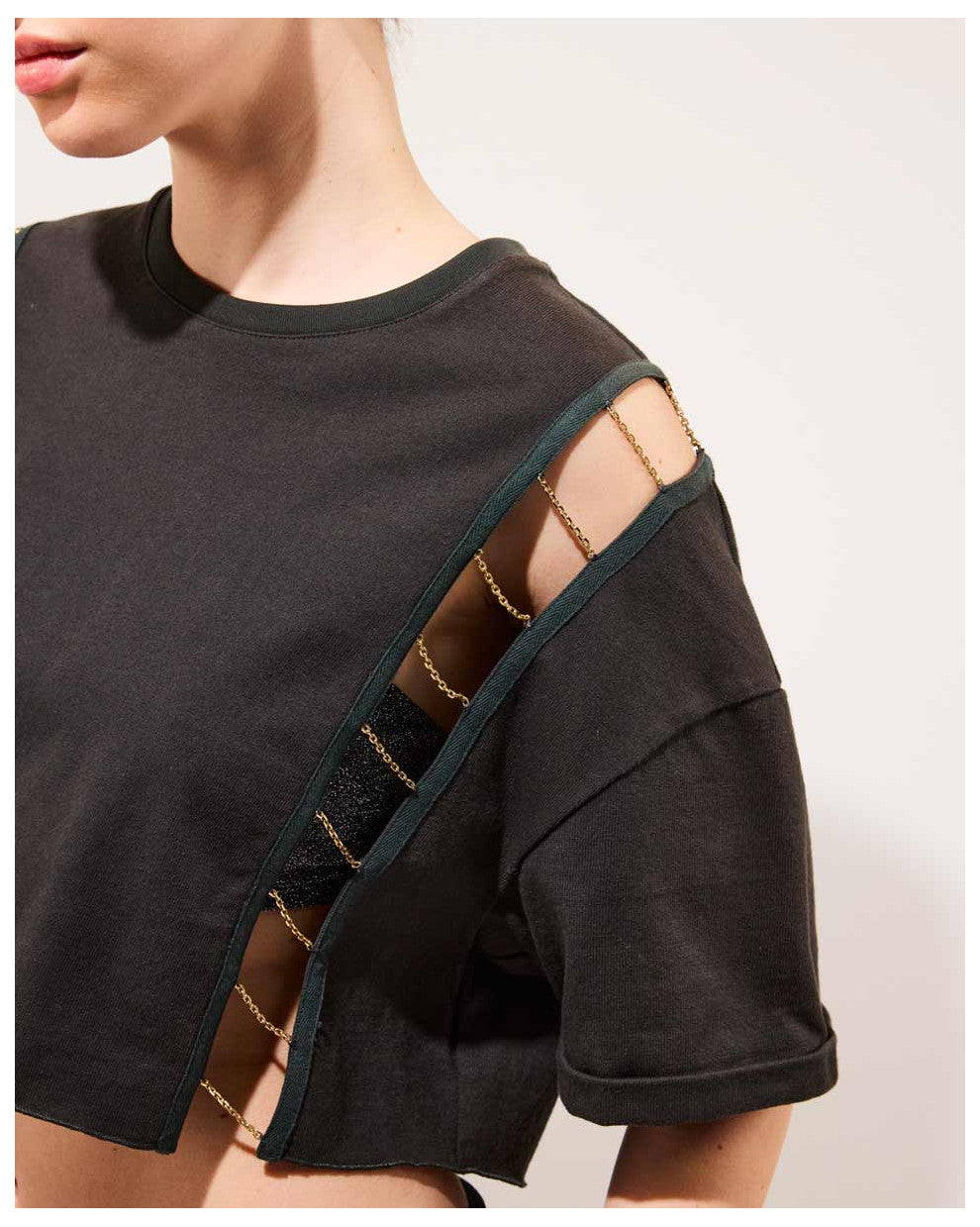 - Chaînes dorées positionnées sur les côtés, comme un bijou intégré