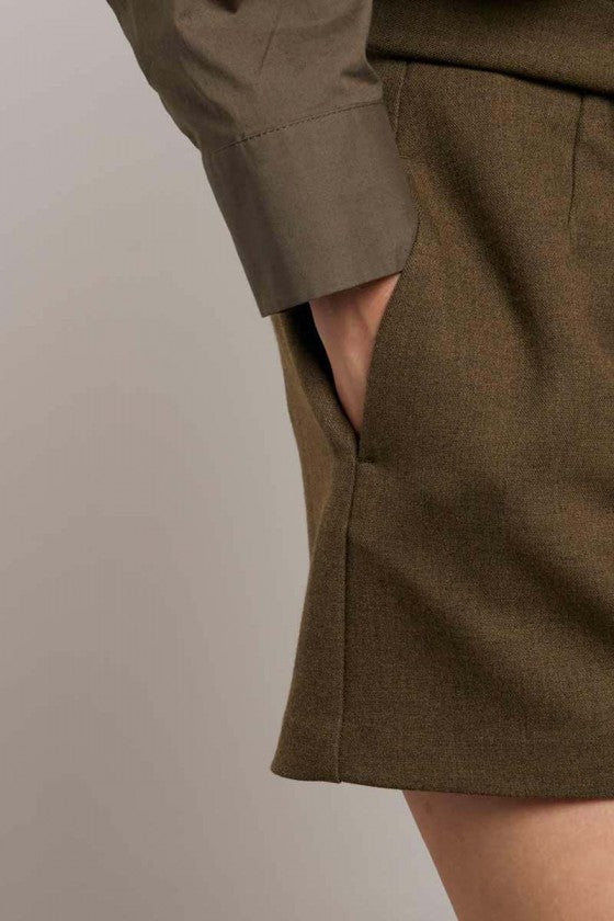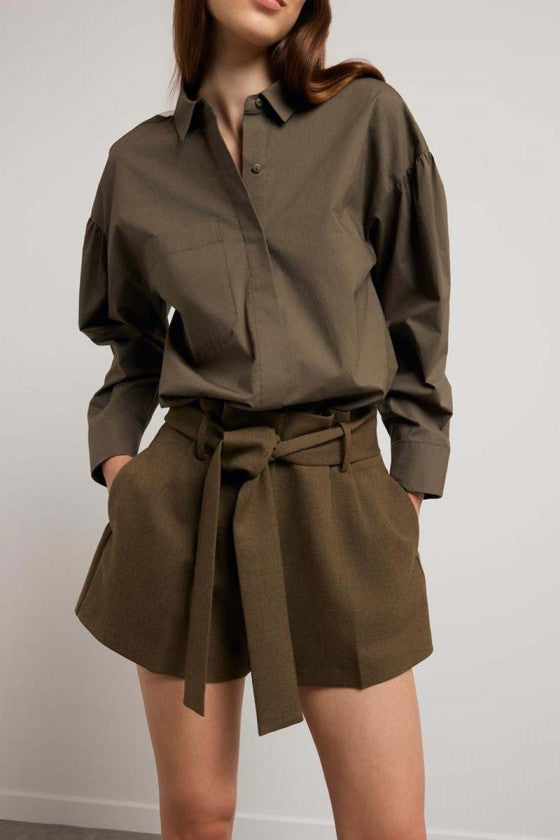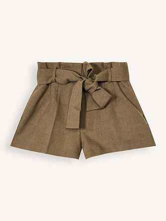Ce short taille haute séduit par sa coupe structurée et son lien à nouer qui marque la taille avec élégance. Sa matière texturée et sa teinte naturelle lui donnent un style à la fois chic et facile à porter.